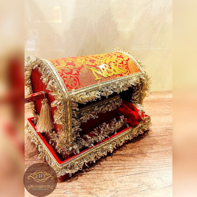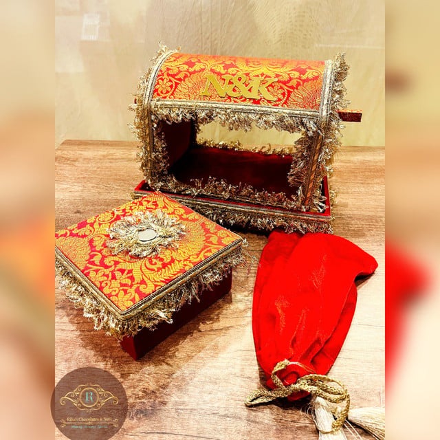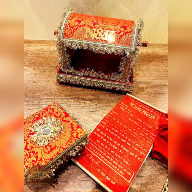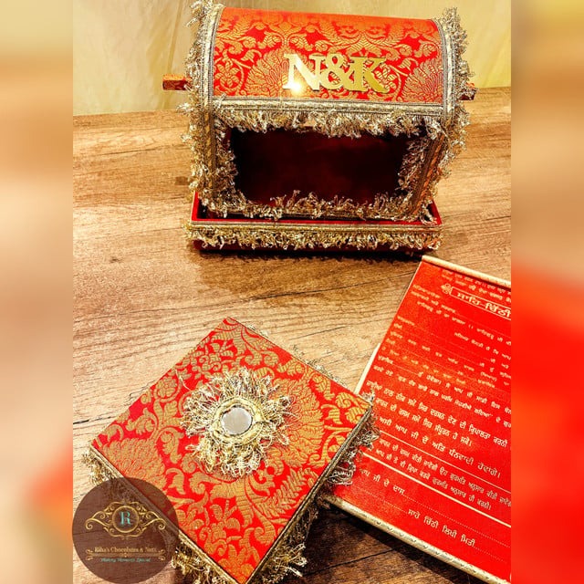 SAAHE CHITHI is a custom in punjabi weddings where the girl’s family prepare a wedding invitation for the boy’s family…. to officially invite the boy’s family to the solemnisation of the marriage and implies that you should now begin preps for the wedding day. Red is the symbol of the renewal of life in Indian culture, which is what the marriage signifies…. So, we curated this beautiful doli saahe chithi in Levander with gold detailing, mirror work & pretty tassels for bride The Set includes an exquisite Palki, dryfruit Box & the Ravishing Silk Saahi Chitti to write the invitation….. DM for customised wedding essentials.. 9815690258, 9878132551. Saahe Chithi available in different Colours and Designs with scroll and sweet box for 1st invitation to the groom’s family